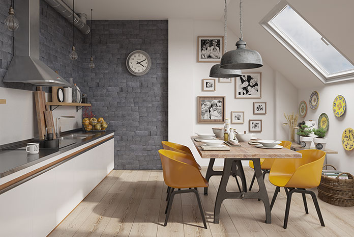 Zdjęcie tytułowe przedstawia wnętrze kuchni w stylu skandynawskim. Aranżacja wykorzystuje aż trzy modne trendy: połączenie faktury drewna i  kamienia, wyrazisty kontrast barwny (biel-grafit) oraz industrialne dodatki. Lampy niczym z fabryki korespondują z prostą formą stołu i krzeseł, ale mimo tego wnętrze nie jest surowe – ocieplają je rodzinne zdjęcia, oraz naturalne akcenty (ceramika, drewno, wiklina). Część jadalna jest wyraźnie oddzielona od przestrzeni przeznaczonej do przygotowania posiłków – w tej roli idealnie sprawdza się właśnie kamień dekoracyjny. Vini Dark Stone Master separuje kuchnię na dwa sposoby – poprzez kolor i fakturę. Modna, zgeometryzowana forma podkreśla nowoczesny charakter aranżacji.